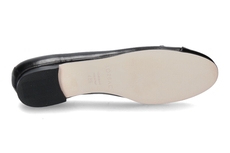 The classic ballerina by Lorbac is made of a mix of smooth and patent leather. The elegant black creates a beautiful overall contrast to the black patent tip. The stylish design is rounded off by a beautiful patent leather bow on the front. The in- and outsole are made of fine leather and contribute to the high level of comfort. Lorbac shoes are 100% made in Italy.