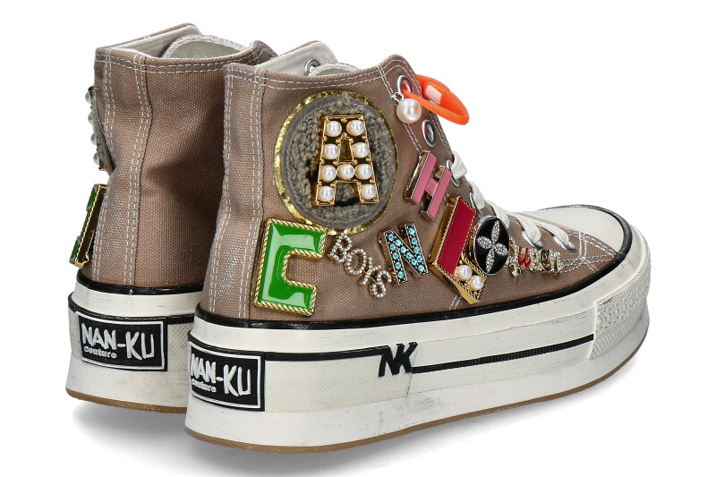 The Nan-Ku Couture high-top sneaker in taupe combines casual style with playful details. Made from high-quality material, the textile lining makes them comfortable to wear. The robust rubber sole ensures good grip and flexibility. A special highlight are the many colorful brooches on the side, which give the shoe a creative and individual touch. This unusual embellishment makes the trainers a real eye-catcher and adds color to any outfit. Perfect for fashion-conscious women who want to combine comfort with a touch of extravagance. Whether worn casually with jeans or as a break in style with a dress - these trainers make a trendy statement.