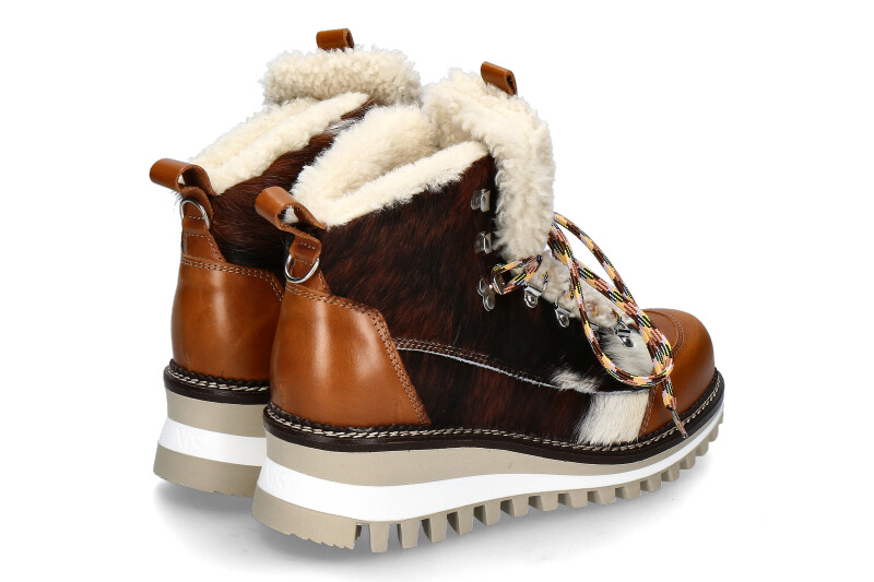 The New Italia Shoes ERIKA boots are stylish, winter-ready boots made from high-quality cowhide in brown and white, finished with cowhide details for a special look. Soft lambskin details on the upper provide additional accents that are not only fashionable but also warming. The laces are threaded through robust silver eyelets, while brown smooth leather details add a sophisticated touch to the design. The sporty, profiled rubber sole offers optimum grip on various surfaces, ideal for winter conditions. Inside, the boots are lined with a combination of warming faux fur, lambskin and virgin wool, which ensures a comfortable fit and excellent insulation. These boots perfectly combine functionality and fashionable appeal.
