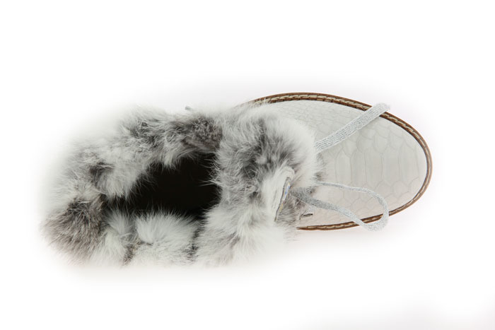 The luxurious ankle boots by New Italia Shoes convince by their very good workmanship. The pearl white coloured leather was printed in a croc-look. The rabbit fur collar completes the overall design. The lining is made of high-quality textile with an exchangeable sheep wool insole. All models are also wind and water repellent. Featuring a profiled rubber sole, the New Italia Shoes ankle boots were manufactured in Italy.